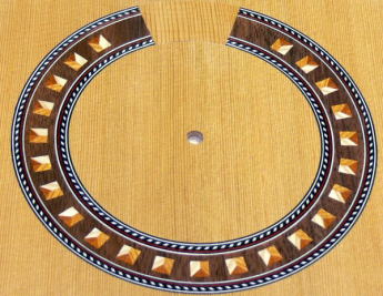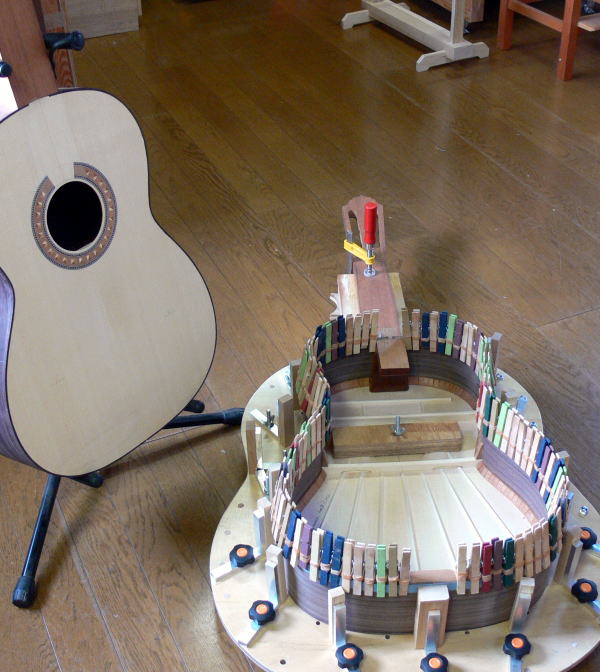 ☆表面板です バスバーは7本で、外側の2本は ハーモニックバーの下をくぐっています 写真はクロージングバーを接着しているところ 竹の弾力で押さえつけます |