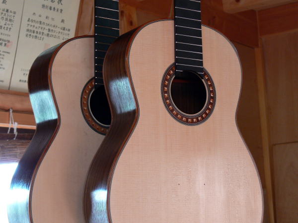 塗装開始しました 私はいきなりセラックニスを刷毛塗りします(写真の状態)。 これが目止め用の下地となります。 ニスが乾いてから、テルテル坊主の頭に軽石の粉(パミス)と アルコールを付けてひたすらグリグリして、最初に塗ったセラックを溶かして削り取られた木の粉もろとも導管に埋め込みます。 この目止め作業、ギター製作のなかで最もハードな仕事です。 そのあとの本塗りもテルテル坊主(タンポ)だけで仕上げます。 良く見るとボディ下部に小さい穴が2つ。ブリッジの位置決め用です。 ブリッジにはサドル溝からピンを打っています。 |