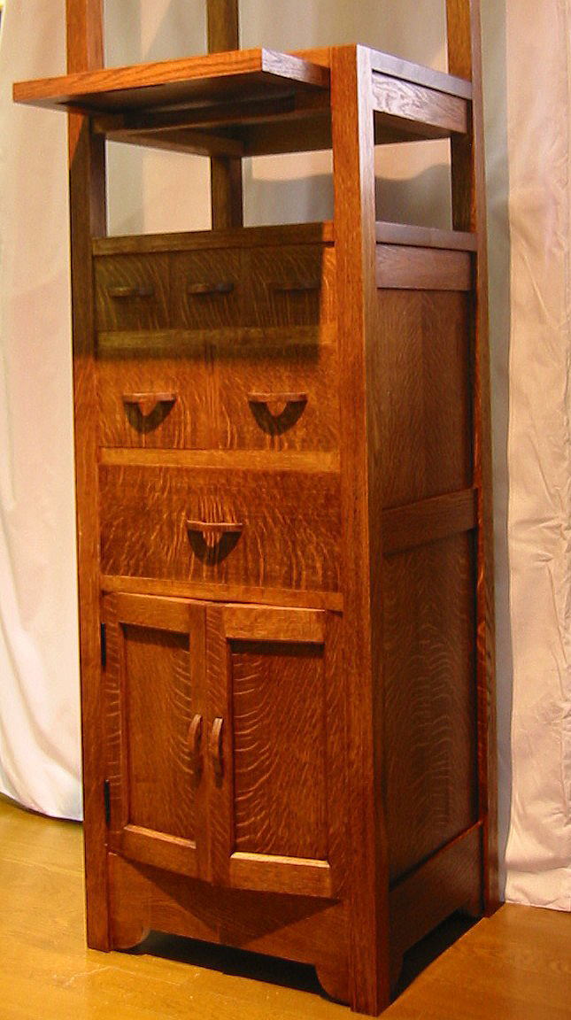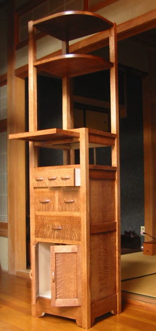なんとなく骨董風なのは柿渋を塗っているからです。ナラ柾目材に特有の「虎斑(とらふ)」をうまく表現