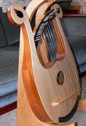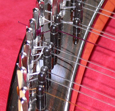 【弾き方】 ひざの上に置いて、体とは直角に構えます 楽器の表側には右手、裏側には左手がきます ピアノの白鍵の音と黒鍵の音で 弦の高さを変えていますので 右手は白鍵弦 左手は黒鍵弦 を基本にすれば たいへん弾きやすいです 弦の色も目印になります C(ド) は紫 F(ファ) は黄色 クラシックギターのように爪を使ったり、 指の腹だけで弾いたり、 決まりはありません 自由な表現が似合います |